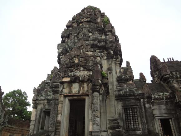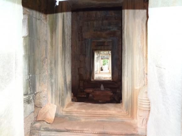 アンコール遺跡でよく見られるのが、上の写真のような作りです。写真ではよくわかりませんが、建物の入り口が一直線にならび、最深部から外を見ることができます。門の大きさも計算されていて、まるであわせ鏡のようです。